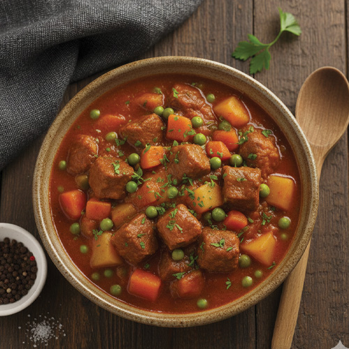 • Combine beef, potatoes, carrots, soup mix, tomato soup, can of water, salt and pepper in Crock Pot.